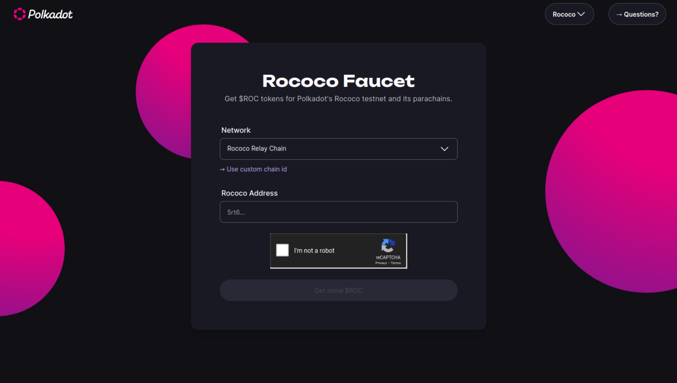 Para conseguir ROC, para esto, usaremos un faucet. Un faucet es una aplicación donde podemos ir a cargar nuestra cuenta con tokens de la testnet, suele existir en las testnets públicas. En el caso de Rococo, existe un faucet web que podemos usar para conseguir ROC.